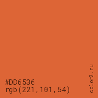 Цвет #DD6536 в цветовой модели RGB обозначается тремя октетами (221, 101, 54) в десятичном формате и #DD6536 в шестнадцатиричном (hex) формате, которые являются интенсивностью красного 221 (hex DD), интенсивность зелёного 101 (hex 65) и интенсивность синего 54 (hex 36).