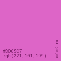 Цвет #DD65C7 в цветовой модели RGB обозначается тремя октетами (221, 101, 199) в десятичном формате и #DD65C7 в шестнадцатиричном (hex) формате, которые являются интенсивностью красного 221 (hex DD), интенсивность зелёного 101 (hex 65) и интенсивность синего 199 (hex C7).