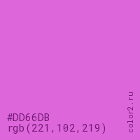 Цвет #DD66DB в цветовой модели RGB обозначается тремя октетами (221, 102, 219) в десятичном формате и #DD66DB в шестнадцатиричном (hex) формате, которые являются интенсивностью красного 221 (hex DD), интенсивность зелёного 102 (hex 66) и интенсивность синего 219 (hex DB).