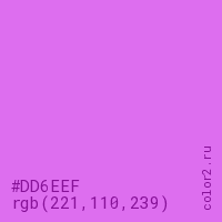 Цвет #DD6EEF в цветовой модели RGB обозначается тремя октетами (221, 110, 239) в десятичном формате и #DD6EEF в шестнадцатиричном (hex) формате, которые являются интенсивностью красного 221 (hex DD), интенсивность зелёного 110 (hex 6E) и интенсивность синего 239 (hex EF).