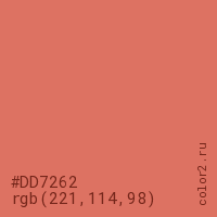 Цвет #DD7262 в цветовой модели RGB обозначается тремя октетами (221, 114, 98) в десятичном формате и #DD7262 в шестнадцатиричном (hex) формате, которые являются интенсивностью красного 221 (hex DD), интенсивность зелёного 114 (hex 72) и интенсивность синего 98 (hex 62).