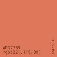 Цвет #DD7759 в цветовой модели RGB обозначается тремя октетами (221, 119, 89) в десятичном формате и #DD7759 в шестнадцатиричном (hex) формате, которые являются интенсивностью красного 221 (hex DD), интенсивность зелёного 119 (hex 77) и интенсивность синего 89 (hex 59).