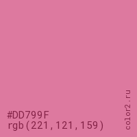Цвет #DD799F в цветовой модели RGB обозначается тремя октетами (221, 121, 159) в десятичном формате и #DD799F в шестнадцатиричном (hex) формате, которые являются интенсивностью красного 221 (hex DD), интенсивность зелёного 121 (hex 79) и интенсивность синего 159 (hex 9F).