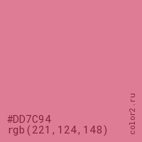 Цвет #DD7C94 в цветовой модели RGB обозначается тремя октетами (221, 124, 148) в десятичном формате и #DD7C94 в шестнадцатиричном (hex) формате, которые являются интенсивностью красного 221 (hex DD), интенсивность зелёного 124 (hex 7C) и интенсивность синего 148 (hex 94).