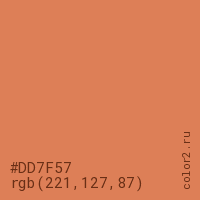 Цвет #DD7F57 в цветовой модели RGB обозначается тремя октетами (221, 127, 87) в десятичном формате и #DD7F57 в шестнадцатиричном (hex) формате, которые являются интенсивностью красного 221 (hex DD), интенсивность зелёного 127 (hex 7F) и интенсивность синего 87 (hex 57).