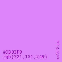 Цвет #DD83F9 в цветовой модели RGB обозначается тремя октетами (221, 131, 249) в десятичном формате и #DD83F9 в шестнадцатиричном (hex) формате, которые являются интенсивностью красного 221 (hex DD), интенсивность зелёного 131 (hex 83) и интенсивность синего 249 (hex F9).