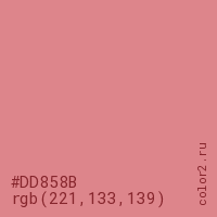 Цвет #DD858B в цветовой модели RGB обозначается тремя октетами (221, 133, 139) в десятичном формате и #DD858B в шестнадцатиричном (hex) формате, которые являются интенсивностью красного 221 (hex DD), интенсивность зелёного 133 (hex 85) и интенсивность синего 139 (hex 8B).