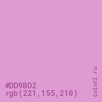 Цвет #DD9BD2 в цветовой модели RGB обозначается тремя октетами (221, 155, 210) в десятичном формате и #DD9BD2 в шестнадцатиричном (hex) формате, которые являются интенсивностью красного 221 (hex DD), интенсивность зелёного 155 (hex 9B) и интенсивность синего 210 (hex D2).