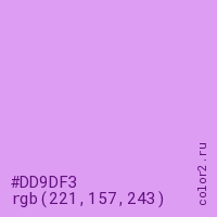 Цвет #DD9DF3 в цветовой модели RGB обозначается тремя октетами (221, 157, 243) в десятичном формате и #DD9DF3 в шестнадцатиричном (hex) формате, которые являются интенсивностью красного 221 (hex DD), интенсивность зелёного 157 (hex 9D) и интенсивность синего 243 (hex F3).
