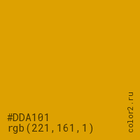 Цвет #DDA101 в цветовой модели RGB обозначается тремя октетами (221, 161, 1) в десятичном формате и #DDA101 в шестнадцатиричном (hex) формате, которые являются интенсивностью красного 221 (hex DD), интенсивность зелёного 161 (hex A1) и интенсивность синего 1 (hex 01).