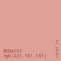 Цвет #DDA197 в цветовой модели RGB обозначается тремя октетами (221, 161, 151) в десятичном формате и #DDA197 в шестнадцатиричном (hex) формате, которые являются интенсивностью красного 221 (hex DD), интенсивность зелёного 161 (hex A1) и интенсивность синего 151 (hex 97).
