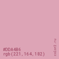 Цвет #DDA4B6 в цветовой модели RGB обозначается тремя октетами (221, 164, 182) в десятичном формате и #DDA4B6 в шестнадцатиричном (hex) формате, которые являются интенсивностью красного 221 (hex DD), интенсивность зелёного 164 (hex A4) и интенсивность синего 182 (hex B6).
