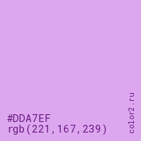Цвет #DDA7EF в цветовой модели RGB обозначается тремя октетами (221, 167, 239) в десятичном формате и #DDA7EF в шестнадцатиричном (hex) формате, которые являются интенсивностью красного 221 (hex DD), интенсивность зелёного 167 (hex A7) и интенсивность синего 239 (hex EF).