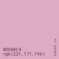 Цвет #DDABC4 в цветовой модели RGB обозначается тремя октетами (221, 171, 196) в десятичном формате и #DDABC4 в шестнадцатиричном (hex) формате, которые являются интенсивностью красного 221 (hex DD), интенсивность зелёного 171 (hex AB) и интенсивность синего 196 (hex C4).