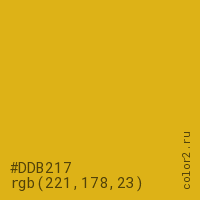 Цвет #DDB217 в цветовой модели RGB обозначается тремя октетами (221, 178, 23) в десятичном формате и #DDB217 в шестнадцатиричном (hex) формате, которые являются интенсивностью красного 221 (hex DD), интенсивность зелёного 178 (hex B2) и интенсивность синего 23 (hex 17).