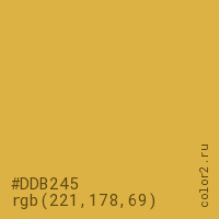 Цвет #DDB245 в цветовой модели RGB обозначается тремя октетами (221, 178, 69) в десятичном формате и #DDB245 в шестнадцатиричном (hex) формате, которые являются интенсивностью красного 221 (hex DD), интенсивность зелёного 178 (hex B2) и интенсивность синего 69 (hex 45).