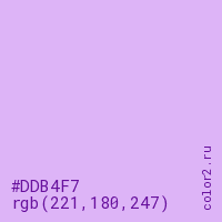 Цвет #DDB4F7 в цветовой модели RGB обозначается тремя октетами (221, 180, 247) в десятичном формате и #DDB4F7 в шестнадцатиричном (hex) формате, которые являются интенсивностью красного 221 (hex DD), интенсивность зелёного 180 (hex B4) и интенсивность синего 247 (hex F7).