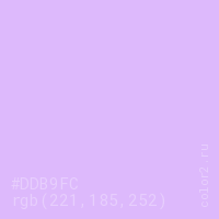 Цвет #DDB9FC в цветовой модели RGB обозначается тремя октетами (221, 185, 252) в десятичном формате и #DDB9FC в шестнадцатиричном (hex) формате, которые являются интенсивностью красного 221 (hex DD), интенсивность зелёного 185 (hex B9) и интенсивность синего 252 (hex FC).