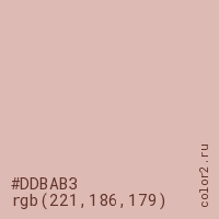 Цвет #DDBAB3 в цветовой модели RGB обозначается тремя октетами (221, 186, 179) в десятичном формате и #DDBAB3 в шестнадцатиричном (hex) формате, которые являются интенсивностью красного 221 (hex DD), интенсивность зелёного 186 (hex BA) и интенсивность синего 179 (hex B3).
