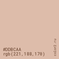 Цвет #DDBCAA в цветовой модели RGB обозначается тремя октетами (221, 188, 170) в десятичном формате и #DDBCAA в шестнадцатиричном (hex) формате, которые являются интенсивностью красного 221 (hex DD), интенсивность зелёного 188 (hex BC) и интенсивность синего 170 (hex AA).