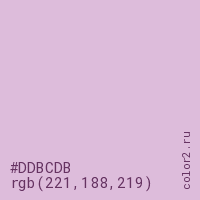 Цвет #DDBCDB в цветовой модели RGB обозначается тремя октетами (221, 188, 219) в десятичном формате и #DDBCDB в шестнадцатиричном (hex) формате, которые являются интенсивностью красного 221 (hex DD), интенсивность зелёного 188 (hex BC) и интенсивность синего 219 (hex DB).