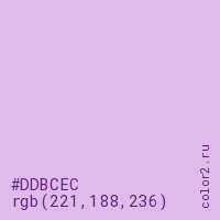 Цвет #DDBCEC в цветовой модели RGB обозначается тремя октетами (221, 188, 236) в десятичном формате и #DDBCEC в шестнадцатиричном (hex) формате, которые являются интенсивностью красного 221 (hex DD), интенсивность зелёного 188 (hex BC) и интенсивность синего 236 (hex EC).