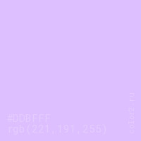 Цвет #DDBFFF в цветовой модели RGB обозначается тремя октетами (221, 191, 255) в десятичном формате и #DDBFFF в шестнадцатиричном (hex) формате, которые являются интенсивностью красного 221 (hex DD), интенсивность зелёного 191 (hex BF) и интенсивность синего 255 (hex FF).