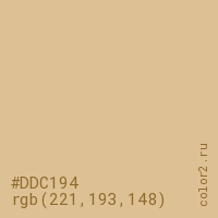 Цвет #DDC194 в цветовой модели RGB обозначается тремя октетами (221, 193, 148) в десятичном формате и #DDC194 в шестнадцатиричном (hex) формате, которые являются интенсивностью красного 221 (hex DD), интенсивность зелёного 193 (hex C1) и интенсивность синего 148 (hex 94).