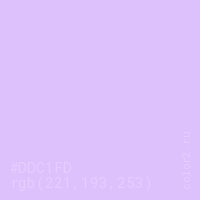 Цвет #DDC1FD в цветовой модели RGB обозначается тремя октетами (221, 193, 253) в десятичном формате и #DDC1FD в шестнадцатиричном (hex) формате, которые являются интенсивностью красного 221 (hex DD), интенсивность зелёного 193 (hex C1) и интенсивность синего 253 (hex FD).