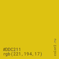 Цвет #DDC211 в цветовой модели RGB обозначается тремя октетами (221, 194, 17) в десятичном формате и #DDC211 в шестнадцатиричном (hex) формате, которые являются интенсивностью красного 221 (hex DD), интенсивность зелёного 194 (hex C2) и интенсивность синего 17 (hex 11).