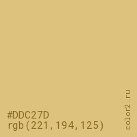 Цвет #DDC27D в цветовой модели RGB обозначается тремя октетами (221, 194, 125) в десятичном формате и #DDC27D в шестнадцатиричном (hex) формате, которые являются интенсивностью красного 221 (hex DD), интенсивность зелёного 194 (hex C2) и интенсивность синего 125 (hex 7D).