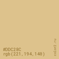 Цвет #DDC28C в цветовой модели RGB обозначается тремя октетами (221, 194, 140) в десятичном формате и #DDC28C в шестнадцатиричном (hex) формате, которые являются интенсивностью красного 221 (hex DD), интенсивность зелёного 194 (hex C2) и интенсивность синего 140 (hex 8C).