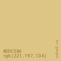 Цвет #DDC586 в цветовой модели RGB обозначается тремя октетами (221, 197, 134) в десятичном формате и #DDC586 в шестнадцатиричном (hex) формате, которые являются интенсивностью красного 221 (hex DD), интенсивность зелёного 197 (hex C5) и интенсивность синего 134 (hex 86).