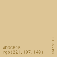 Цвет #DDC595 в цветовой модели RGB обозначается тремя октетами (221, 197, 149) в десятичном формате и #DDC595 в шестнадцатиричном (hex) формате, которые являются интенсивностью красного 221 (hex DD), интенсивность зелёного 197 (hex C5) и интенсивность синего 149 (hex 95).