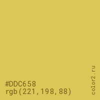 Цвет #DDC658 в цветовой модели RGB обозначается тремя октетами (221, 198, 88) в десятичном формате и #DDC658 в шестнадцатиричном (hex) формате, которые являются интенсивностью красного 221 (hex DD), интенсивность зелёного 198 (hex C6) и интенсивность синего 88 (hex 58).