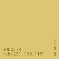 Цвет #DDC673 в цветовой модели RGB обозначается тремя октетами (221, 198, 115) в десятичном формате и #DDC673 в шестнадцатиричном (hex) формате, которые являются интенсивностью красного 221 (hex DD), интенсивность зелёного 198 (hex C6) и интенсивность синего 115 (hex 73).