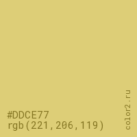 Цвет #DDCE77 в цветовой модели RGB обозначается тремя октетами (221, 206, 119) в десятичном формате и #DDCE77 в шестнадцатиричном (hex) формате, которые являются интенсивностью красного 221 (hex DD), интенсивность зелёного 206 (hex CE) и интенсивность синего 119 (hex 77).