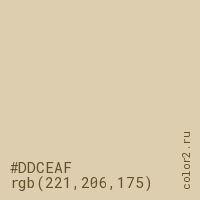 Цвет #DDCEAF в цветовой модели RGB обозначается тремя октетами (221, 206, 175) в десятичном формате и #DDCEAF в шестнадцатиричном (hex) формате, которые являются интенсивностью красного 221 (hex DD), интенсивность зелёного 206 (hex CE) и интенсивность синего 175 (hex AF).