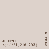 Цвет #DDD2CB в цветовой модели RGB обозначается тремя октетами (221, 210, 203) в десятичном формате и #DDD2CB в шестнадцатиричном (hex) формате, которые являются интенсивностью красного 221 (hex DD), интенсивность зелёного 210 (hex D2) и интенсивность синего 203 (hex CB).