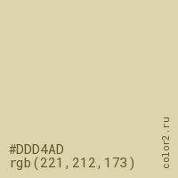 Цвет #DDD4AD в цветовой модели RGB обозначается тремя октетами (221, 212, 173) в десятичном формате и #DDD4AD в шестнадцатиричном (hex) формате, которые являются интенсивностью красного 221 (hex DD), интенсивность зелёного 212 (hex D4) и интенсивность синего 173 (hex AD).