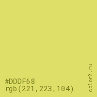 Цвет #DDDF68 в цветовой модели RGB обозначается тремя октетами (221, 223, 104) в десятичном формате и #DDDF68 в шестнадцатиричном (hex) формате, которые являются интенсивностью красного 221 (hex DD), интенсивность зелёного 223 (hex DF) и интенсивность синего 104 (hex 68).