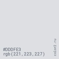 Цвет #DDDFE3 в цветовой модели RGB обозначается тремя октетами (221, 223, 227) в десятичном формате и #DDDFE3 в шестнадцатиричном (hex) формате, которые являются интенсивностью красного 221 (hex DD), интенсивность зелёного 223 (hex DF) и интенсивность синего 227 (hex E3).