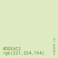 Цвет #DDEAC2 в цветовой модели RGB обозначается тремя октетами (221, 234, 194) в десятичном формате и #DDEAC2 в шестнадцатиричном (hex) формате, которые являются интенсивностью красного 221 (hex DD), интенсивность зелёного 234 (hex EA) и интенсивность синего 194 (hex C2).