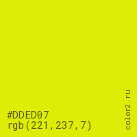 Цвет #DDED07 в цветовой модели RGB обозначается тремя октетами (221, 237, 7) в десятичном формате и #DDED07 в шестнадцатиричном (hex) формате, которые являются интенсивностью красного 221 (hex DD), интенсивность зелёного 237 (hex ED) и интенсивность синего 7 (hex 07).