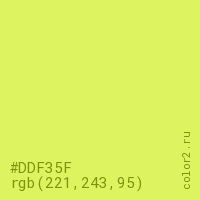 Цвет #DDF35F в цветовой модели RGB обозначается тремя октетами (221, 243, 95) в десятичном формате и #DDF35F в шестнадцатиричном (hex) формате, которые являются интенсивностью красного 221 (hex DD), интенсивность зелёного 243 (hex F3) и интенсивность синего 95 (hex 5F).