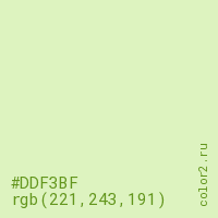 Цвет #DDF3BF в цветовой модели RGB обозначается тремя октетами (221, 243, 191) в десятичном формате и #DDF3BF в шестнадцатиричном (hex) формате, которые являются интенсивностью красного 221 (hex DD), интенсивность зелёного 243 (hex F3) и интенсивность синего 191 (hex BF).