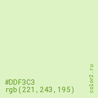 Цвет #DDF3C3 в цветовой модели RGB обозначается тремя октетами (221, 243, 195) в десятичном формате и #DDF3C3 в шестнадцатиричном (hex) формате, которые являются интенсивностью красного 221 (hex DD), интенсивность зелёного 243 (hex F3) и интенсивность синего 195 (hex C3).