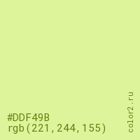 Цвет #DDF49B в цветовой модели RGB обозначается тремя октетами (221, 244, 155) в десятичном формате и #DDF49B в шестнадцатиричном (hex) формате, которые являются интенсивностью красного 221 (hex DD), интенсивность зелёного 244 (hex F4) и интенсивность синего 155 (hex 9B).