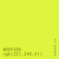 Цвет #DDF53D в цветовой модели RGB обозначается тремя октетами (221, 245, 61) в десятичном формате и #DDF53D в шестнадцатиричном (hex) формате, которые являются интенсивностью красного 221 (hex DD), интенсивность зелёного 245 (hex F5) и интенсивность синего 61 (hex 3D).