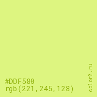 Цвет #DDF580 в цветовой модели RGB обозначается тремя октетами (221, 245, 128) в десятичном формате и #DDF580 в шестнадцатиричном (hex) формате, которые являются интенсивностью красного 221 (hex DD), интенсивность зелёного 245 (hex F5) и интенсивность синего 128 (hex 80).